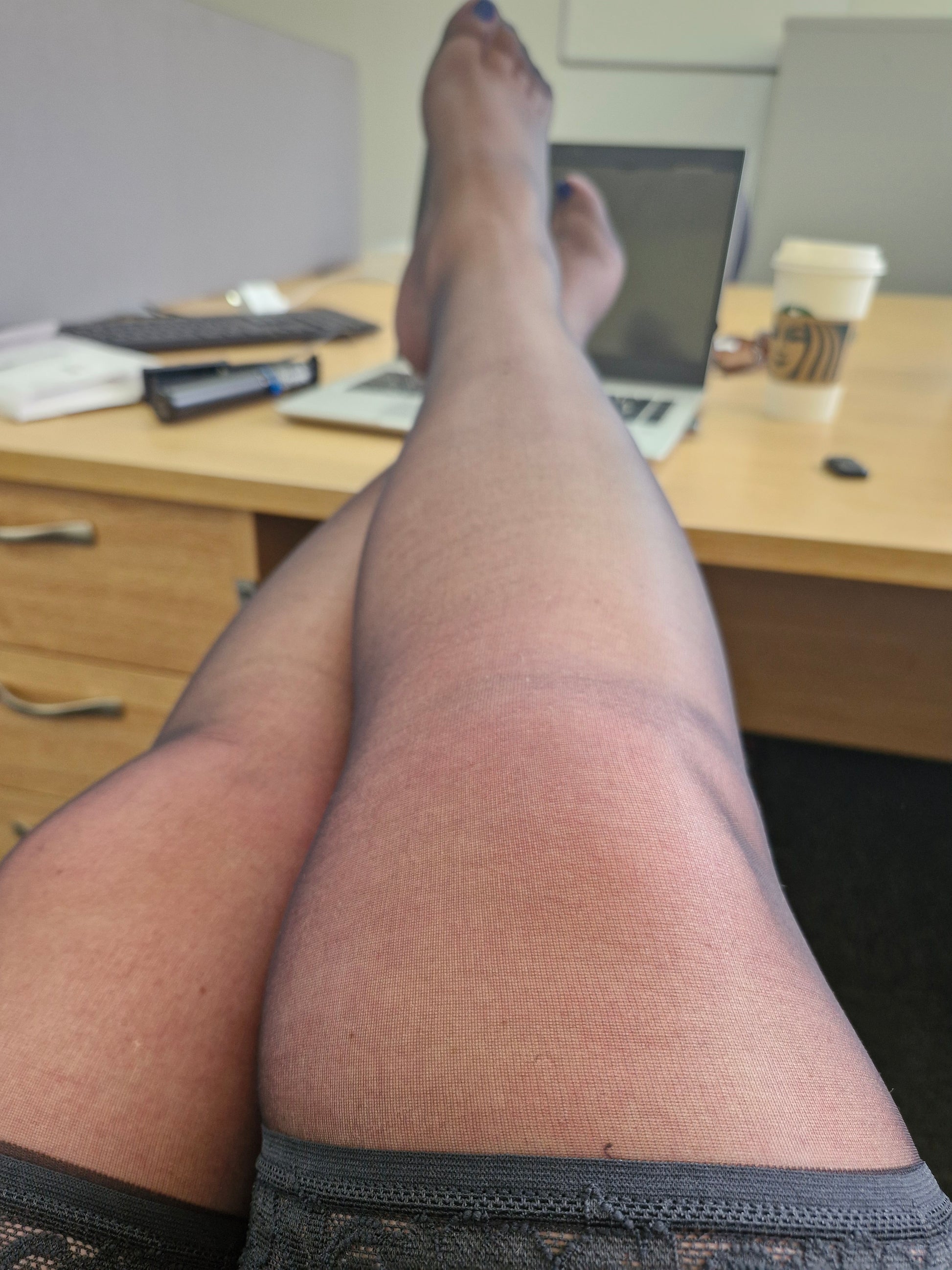 Worn Sexy black coloured and sheer stockings, in size Large.